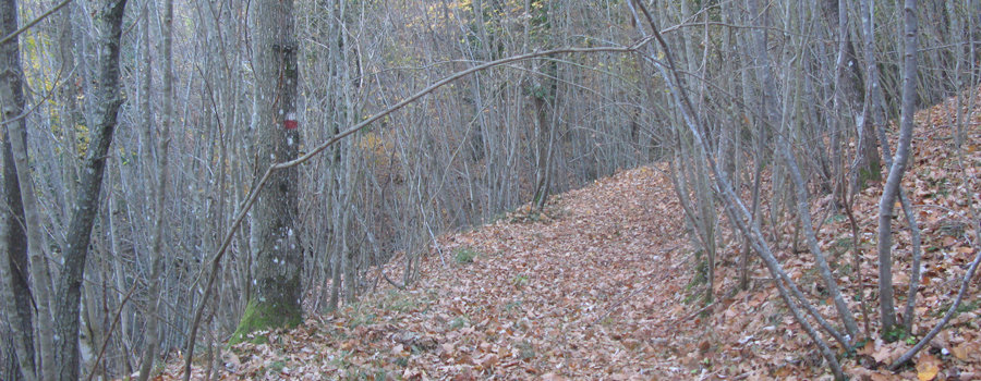 In questo punto la stradina si tramuta in sentiero, che si inoltra nel bosco lasciandosi sulla destra il costone sopracitato per proseguire tagliando a mezza costa il versante ovest della montagna, in un interminabile successione di piccole salite e discese.
