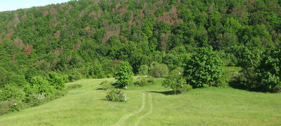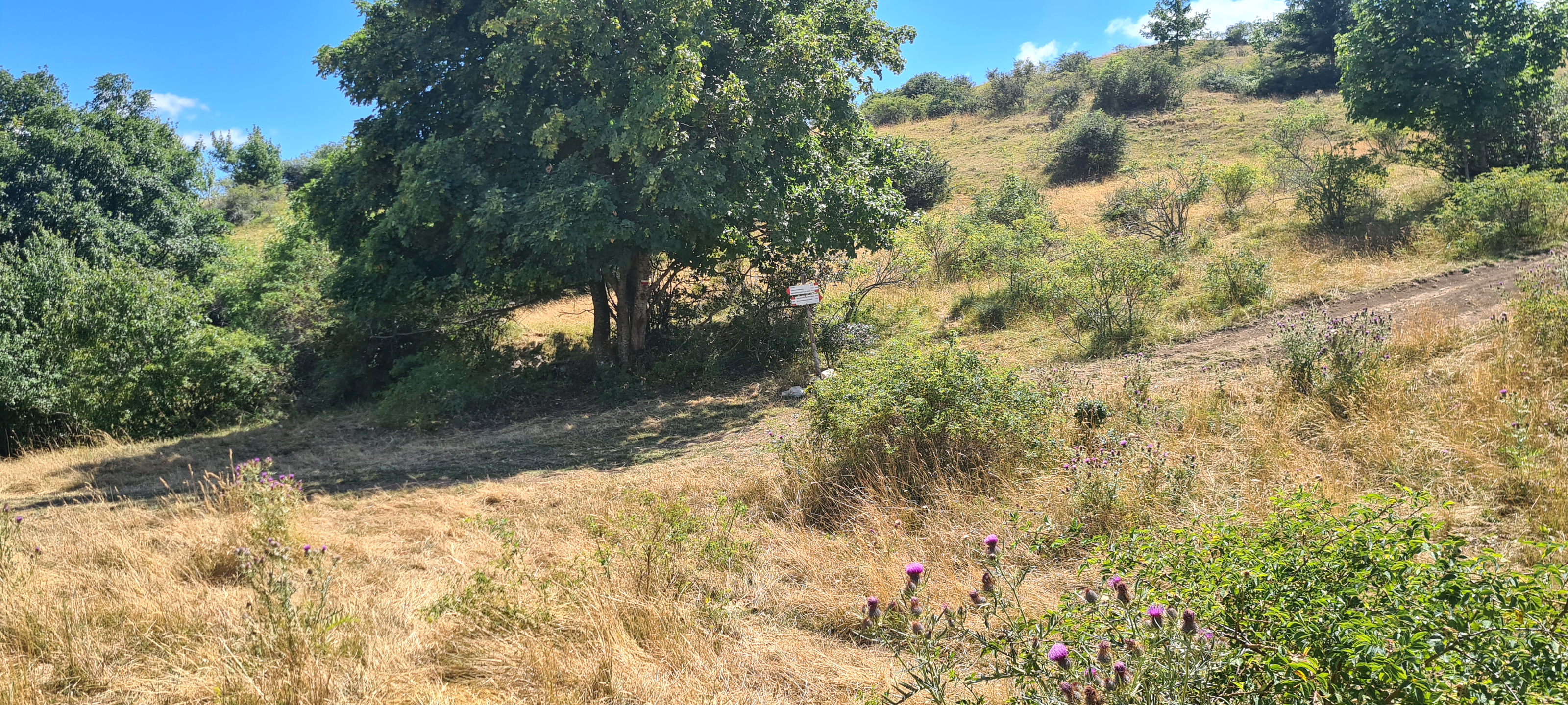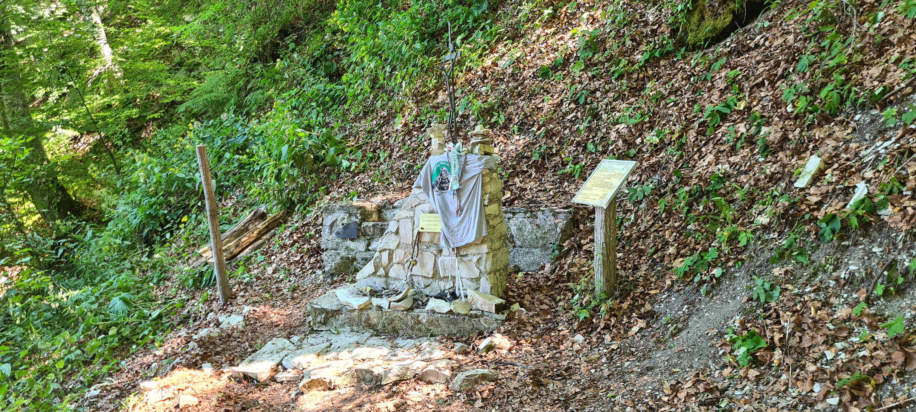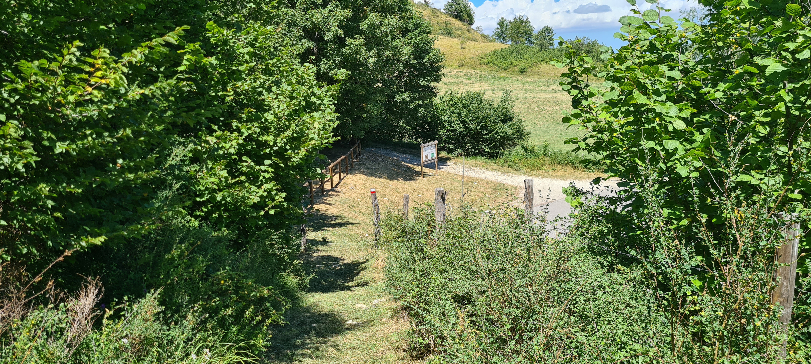 Terminata la sosta presso il memoriale si riprende a salire con discreta pendenza, si supera uno stretto tornante, si attraversa un cancelletto di legno e si giunge sui prati, a poca distanza dalla biforcazione incontrata in precedenza. Con una breve discesa si raggiunge nuovamente il sentiero completando l'anello.