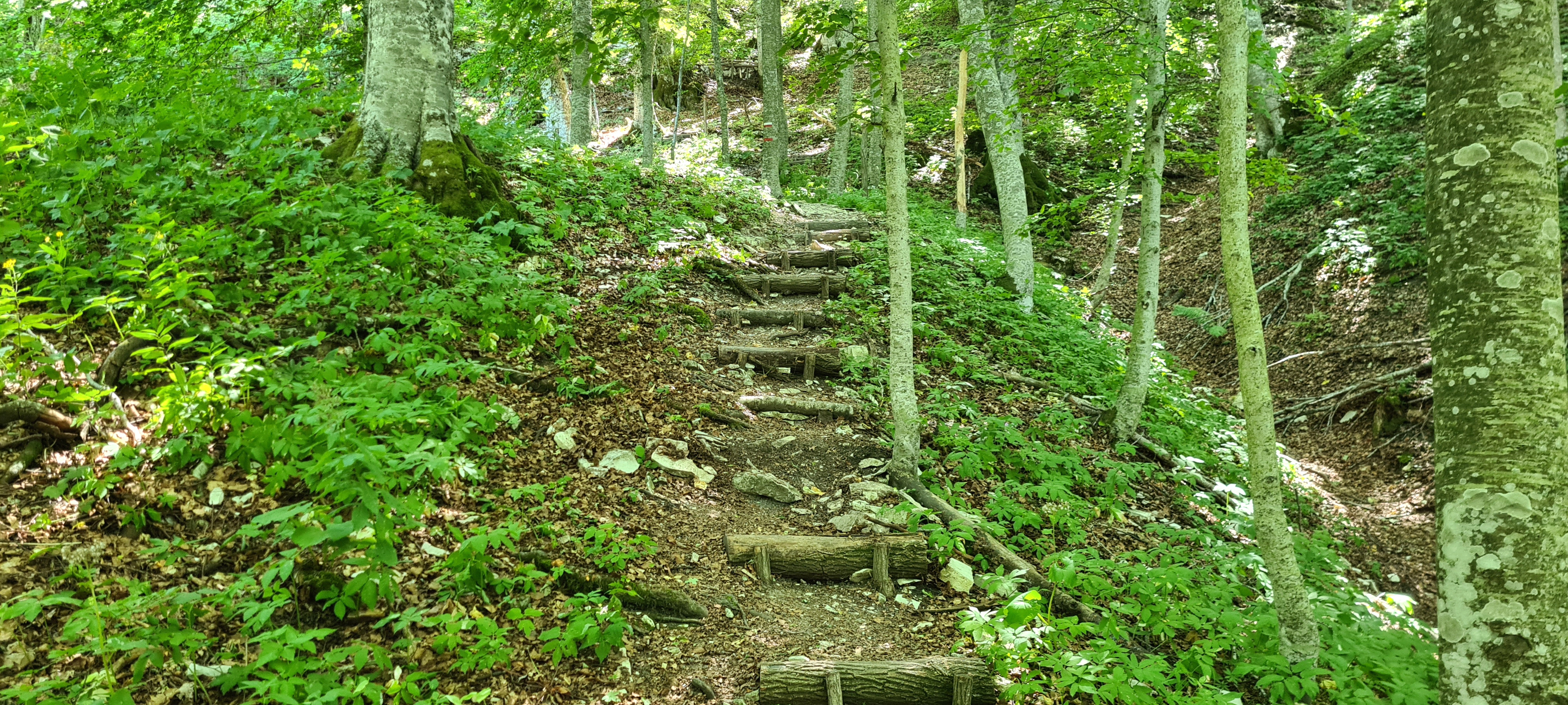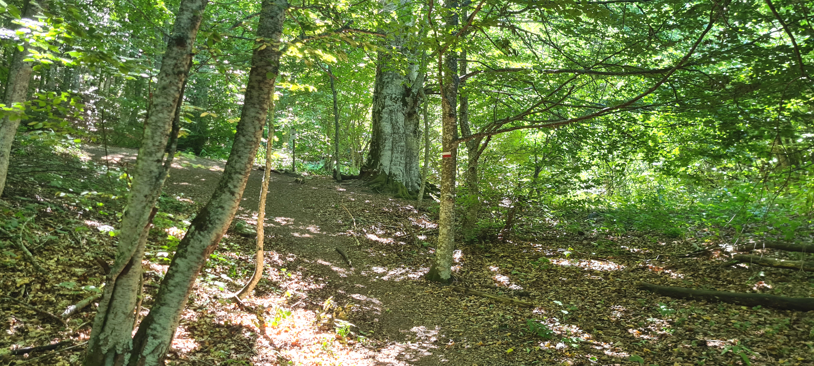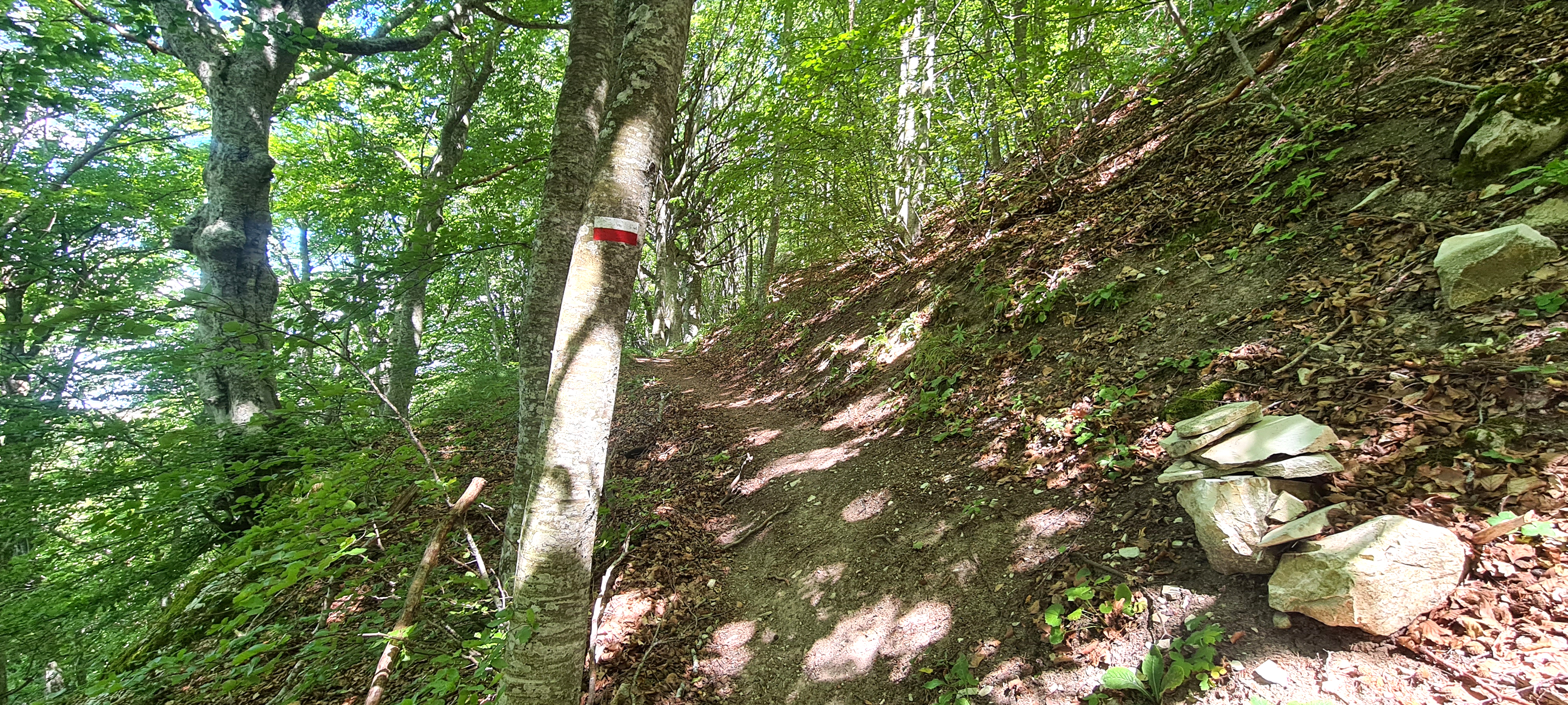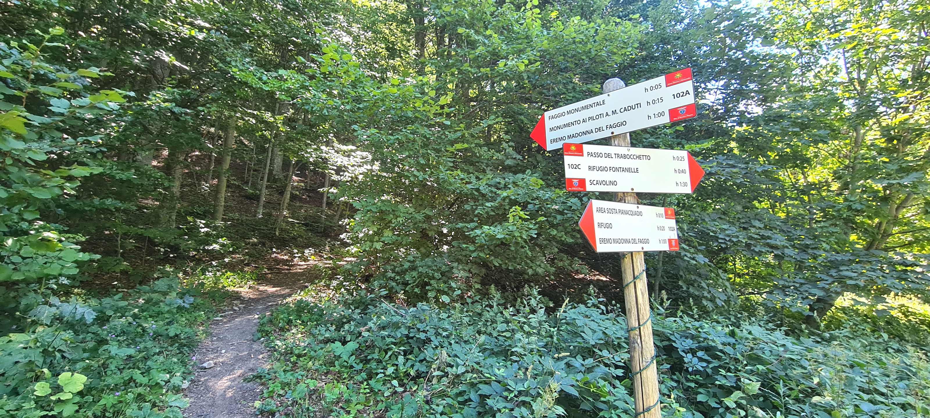 Oltrepassati gli incroci ci si addentra nella faggeta, raggiungendo in circa 5 minuti lo spettacolare Faggio Monumentale, un albero alto ben 28 metri, con una circonferenza di 4,75 metri ed un'età presunta di più di 260 anni. Oltrepassato il faggio il sentiero compie una secca svolta, prosegue in falsopiano ed incrocia nuovamente il 102B, quindi prende a salire decisamente e, mediante alcuni gradini di legno, raggiunge infine il luogo dove è stato posto il Monumento agli Aviatori.
