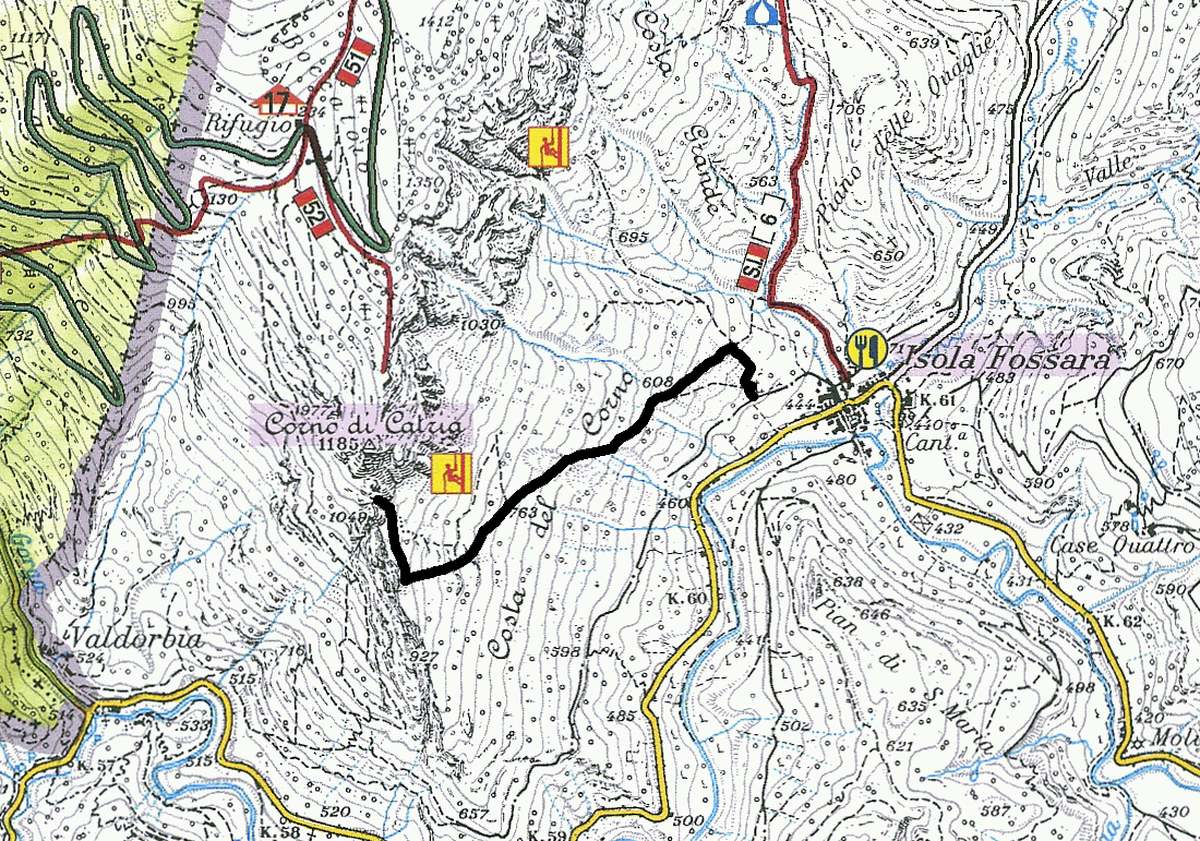 Nella parte finale del traverso si raggiunge una zona dove l’orientamento diventa più complesso, la vegetazione ostruisce parzialmente il percorso ed occorre affidarsi agli sporadici segni presenti sul percorso.