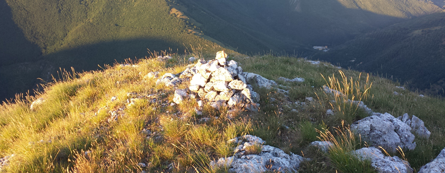 Il sentiero sale quindi diagonale lungo il versante, incrociando la strada per 4 volte (la seconda e la terza a distanza molto ravvicinata, vicino ad una curva) prima di lasciarsela definitivamente sulla sinistra, nei pressi di un ampio tornante, da dove si incontrano altri segni evidenti, che conducono dapprima in un fossato all’interno del bosco e poi ad uscire sui prati, su traccia ben marcata, costeggiando anche alcune caratteristiche roccette; qui si incrocia il sentiero 29, che si diparte verso destra, diretto alla sella del Corno del Catria