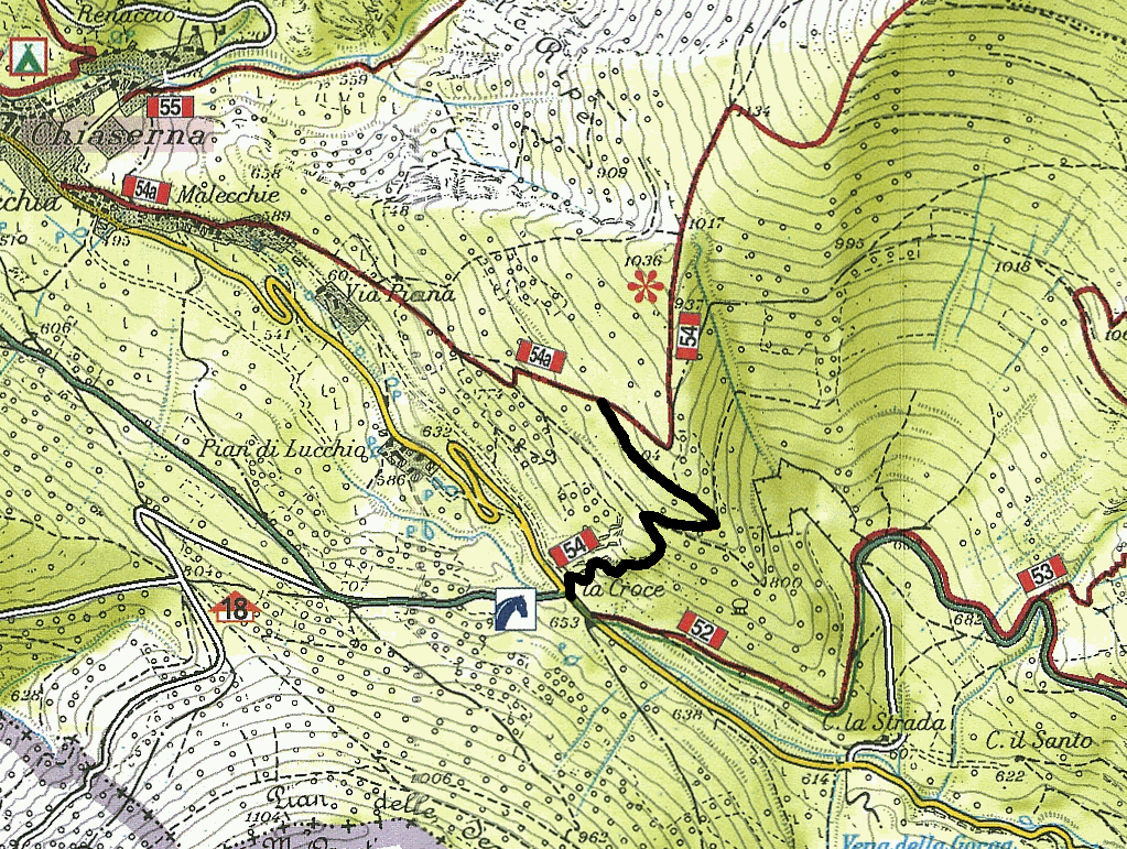 La segnatura recentemente risistemata permette di individuare la via corretta, che entra nuovamente in un breve tratto all’ombra degli alberi per poi terminare incrociando l’ampia traccia del sentiero 54, che sale da Malecchie verso la vetta.