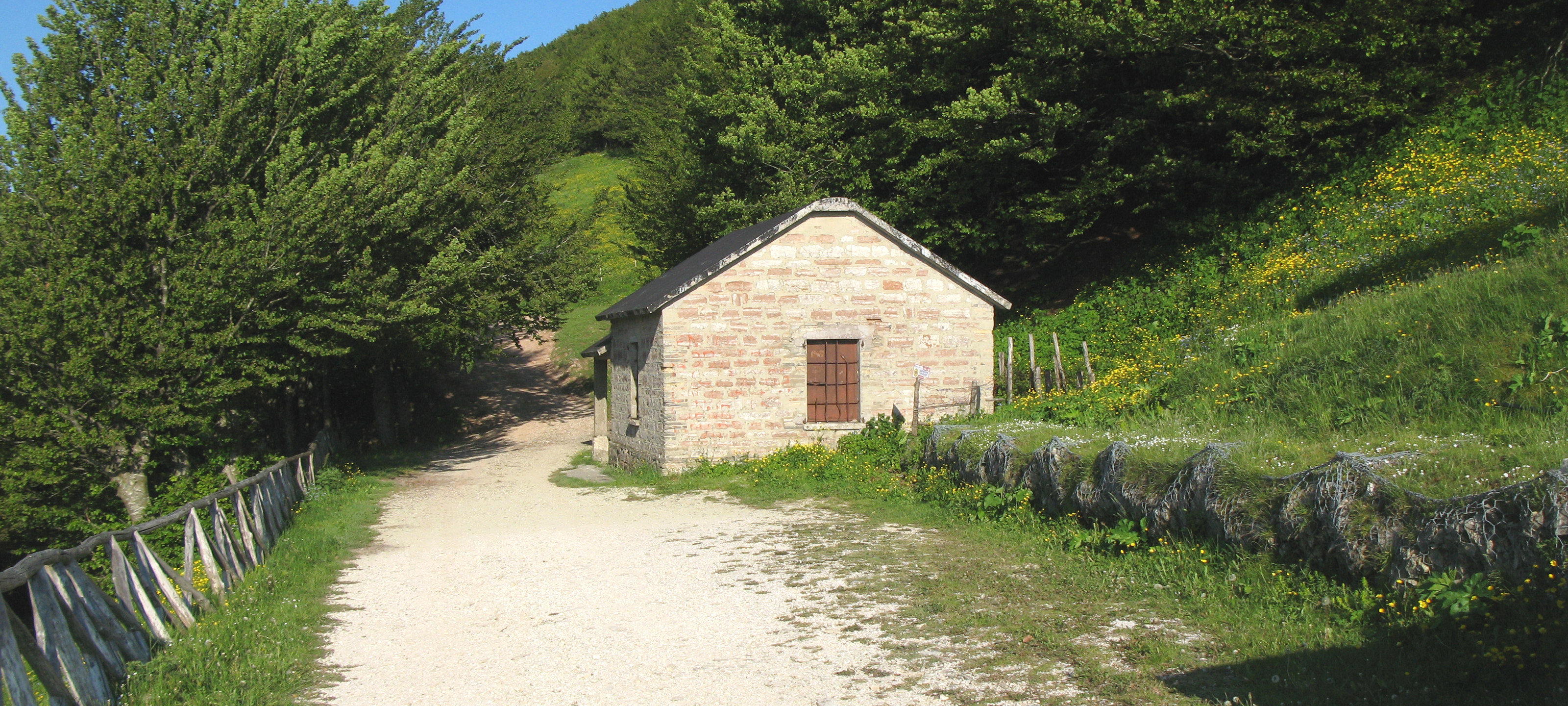 Raggiunta la sorgente, su tratto di ripido sentiero che presenta ora un fondo di morbida terra, ed apprezzate le fresche acque che è in grado di fornire (attenzione, se non si effettuano deviazioni questa è l’ultima presa d’acqua nel cammino verso la vetta..), si prosegue all’interno del bosco sempre in decisa salita, fino a raggiungere nuovamente la strada che si percorre fino ad una curva a sinistra da dove, sulla destra, si stacca una stradina che conduce al rifugio Capanna dei Porci.