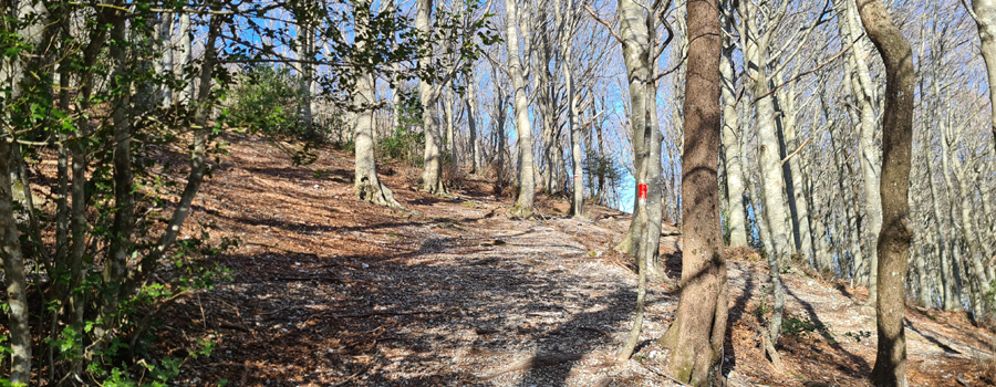 Il bosco inizia a diradarsi quando si incrocia il sentiero 75, che sale da Acquaviva, e con il quale il percorso si fonde, svoltando verso sinistra ed iniziando un tratto comune, che corrisponde alla bella cresta molto panoramica del Monte Morcia.