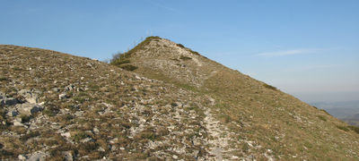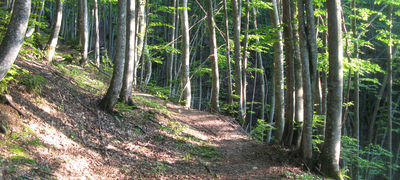 Tornati al crinale dello Schioppettino si prosegue per una traccetta incerta verso destra, in discreta discesa, entrando ben presto nel bosco in cui il sentiero si snoda, uscendone a volte con tratti panoramici sulla valle sottostante, fino a raggiungere i tornanti della strada sbrecciata di servizio alla stazione sciistica, che si raggiunge dopo una ripida discesa.