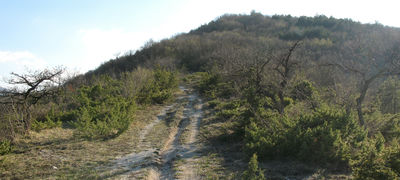 Superata una svolta a sinistra si continua a salire, si oltrepassa l'incrocio non segnalato con il sentiero 465a, quindi si prosegue all'interno del bosco fino al punto in cui l'ambiente si apre lasciando spazio ai prati punteggiati di ginepri che ricoprono le pendici del Monte del Picchio; qui il percorso termina incrociando il sentiero 463 che si sviluppa lungo il crinale.