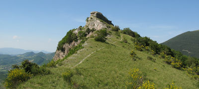 Terminata la doverosa sosta si prosegue lungo il canalone ghiaioso che si trova a fianco della balza, incontrando il bivio, ben segnalato, con il sentiero 4 che conduce alla Grotta di Nerone, da superare proseguendo in direzione del Rifugio Corsini.