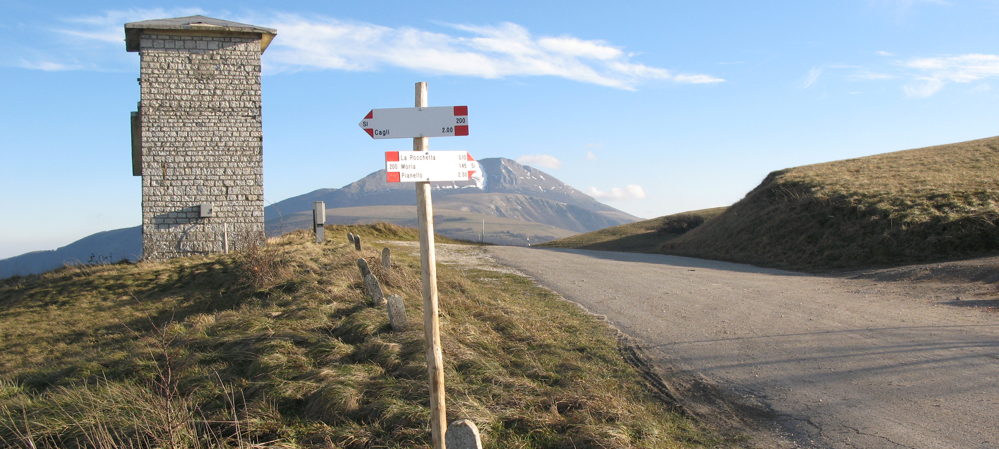 Dal centro di Cagli si imbocca la strada per il Monte Petrano, raggiunto il primo tornante si parcheggia la macchina (parcheggio comodo 20 metri dopo il tornante stesso) e si imbocca il sentiero ben segnalato nei pressi di una edicola.
