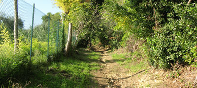 Terminata la discesa il sentiero confluisce nuovamente sulla familiare strada, che ora si segue per un tratto piuttosto lungo, di qualche km (qui si incontrano sulla sinistra i sentieri 156a e 156b), abbandonandola solamente per breve tratto, appena oltrepassato il bivio per Baia Vallugola (sentiero 151d), prendendo sulla sinistra una traccia sterrata ben segnalata che attraversa il retro di un residence, prima di rientrare su asfalto ancora una volta.