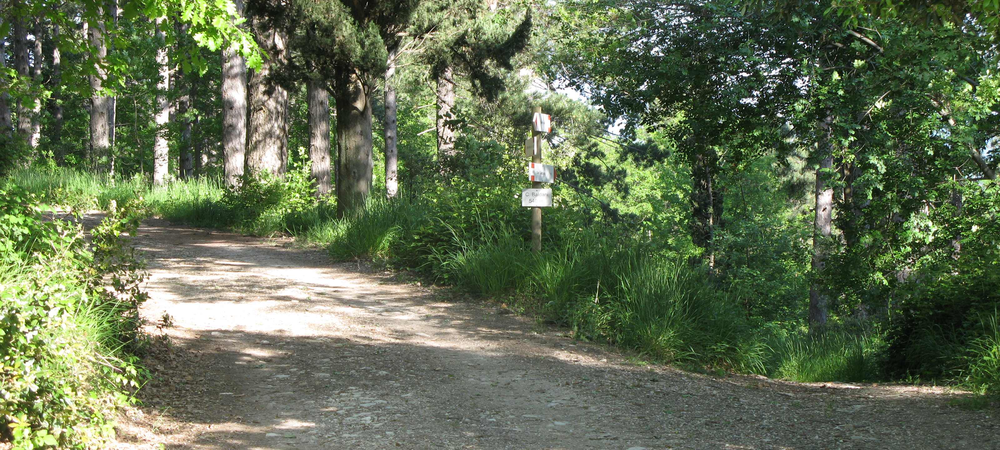 Proseguendo si incontra, sulla sinistra, l'incrocio con un ramo secondario che scende nuovamente verso la Flaminia (da ignorare) e successivamente si incontra un ampio tornante superato il quale si affronta un ultimo tratto dalle forti pendenze, prima che le stesse inizino ad attenuarsi ed il sentiero confluisca in una strada sterrata ben più ampia, circondata da un bosco ora costituito da conifere ad alto fusto, che permette in breve tempo di raggiungere la piccola costruzione di Ca' Baldani (quota 540m), nei pressi dell'innesto del sentiero 143 che proviene da Campo D'Asino.