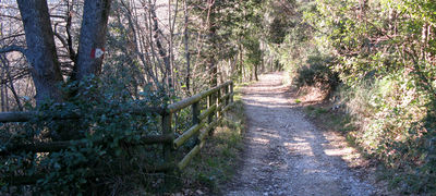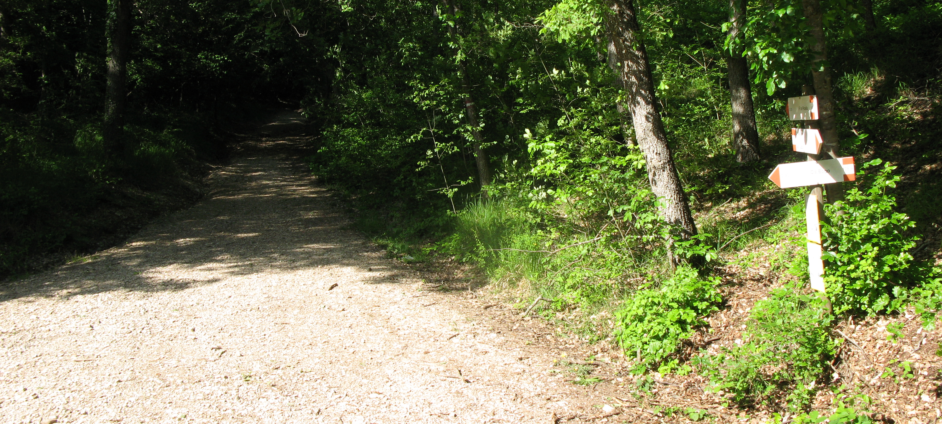 Il primo tratto di sentiero è il più duro, le pendenze sono abbastanza marcate e si guadagna quota velocemente inoltrandosi in un bosco a bassi fusti, con diverse aperture panoramiche sulla valle sottostante, sulla sinistra, dove le verdi acque del Candigliano integrate nell'armonioso paesaggio rappresentano un ottimo diversivo per ingannare la fatica...