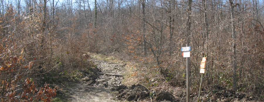La partenza, ben segnalata con freccia direzionale indicante i tempi di percorrenza, si trova nei pressi delle strutture ricettive della Cantoniera, su breve tratto di strada asfaltata che cede il passo, non appena ci si inoltra nel bosco, ad una facile ed ampia stradina sterrata che si diparte in leggera discesa verso sinistra (a destra invece si trova l’attacco del sentiero 121). Dopo poche centinaia di metri si incrocia la strada asfaltata proveniente da Miratoio, la si oltrepassa e si riprende su sentiero molto ampio e praticamente pianeggiante.