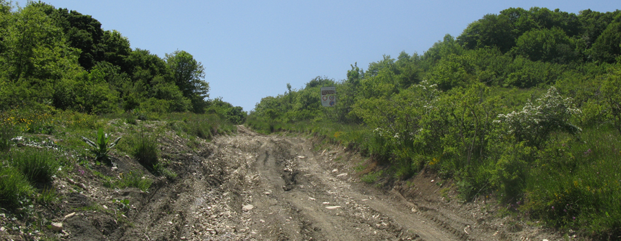 Superato il campeggio la strada asfaltata viene sostituita da una sterrata a servizio del vicino Poligono Militare (per l’attraversamento di questa zona occorre sincerarsi che non vi siano esercitazioni in atto, in concomitanza con tali eventi l’accesso è interdetto), che sale all’interno del bosco con pendenze ora leggermente più marcate, sbucando infine sui prati, con l’ambiente che si apre d’improvviso, lasciando la possibilità di ammirare l’imponente sagoma del Sasso Simone che oscura parzialmente quella del Simoncello.