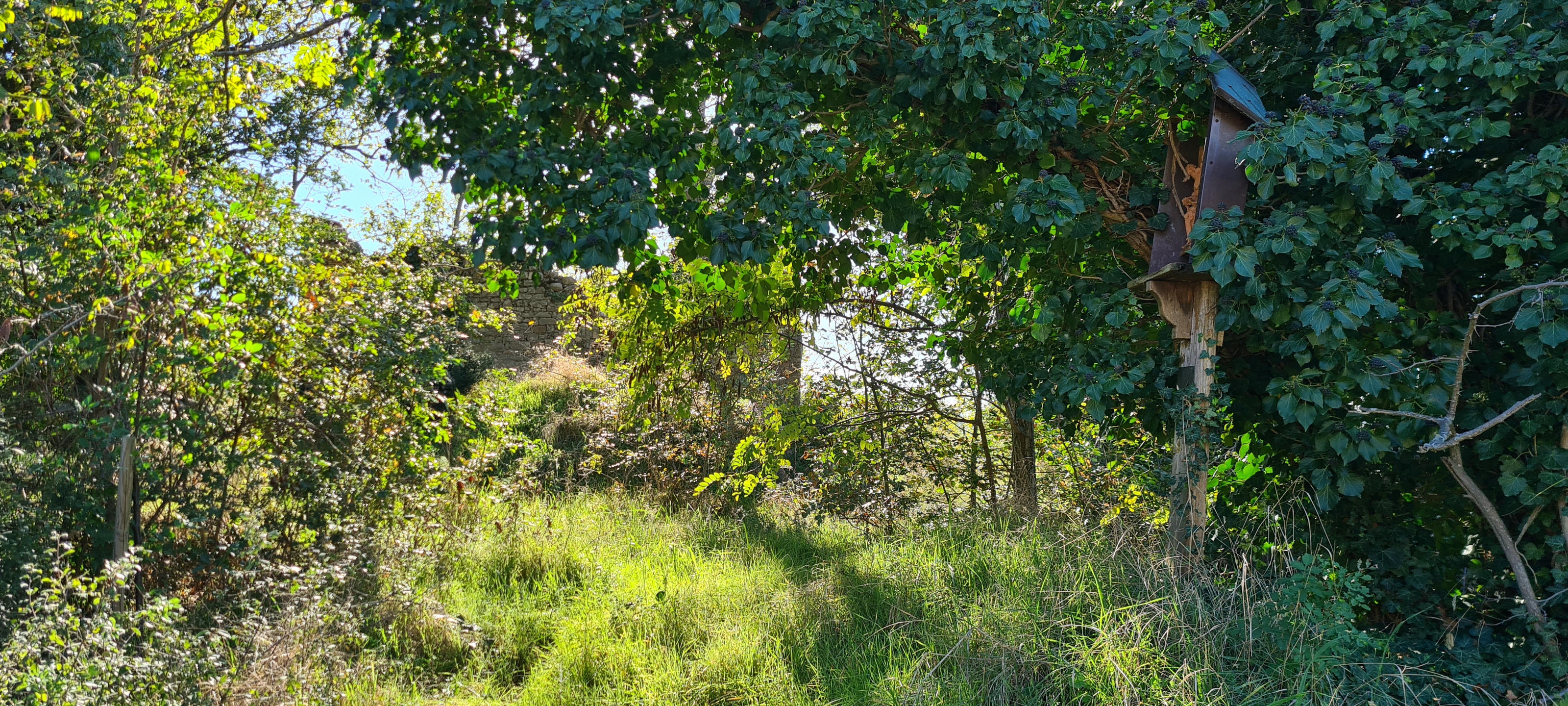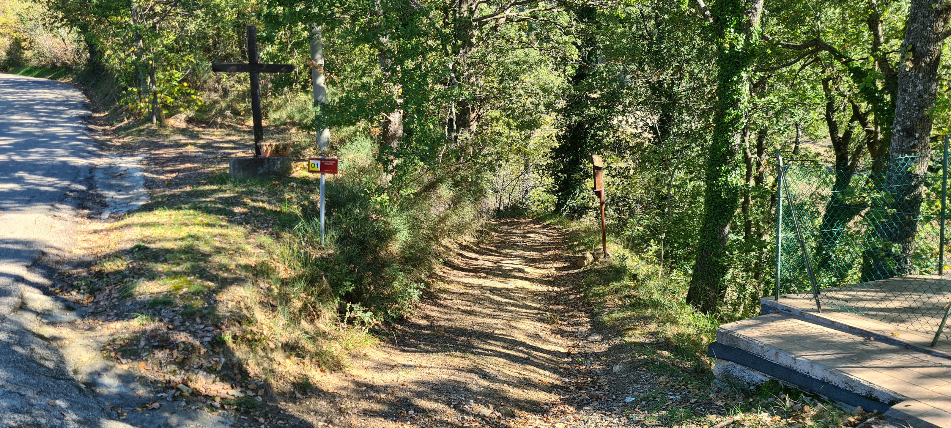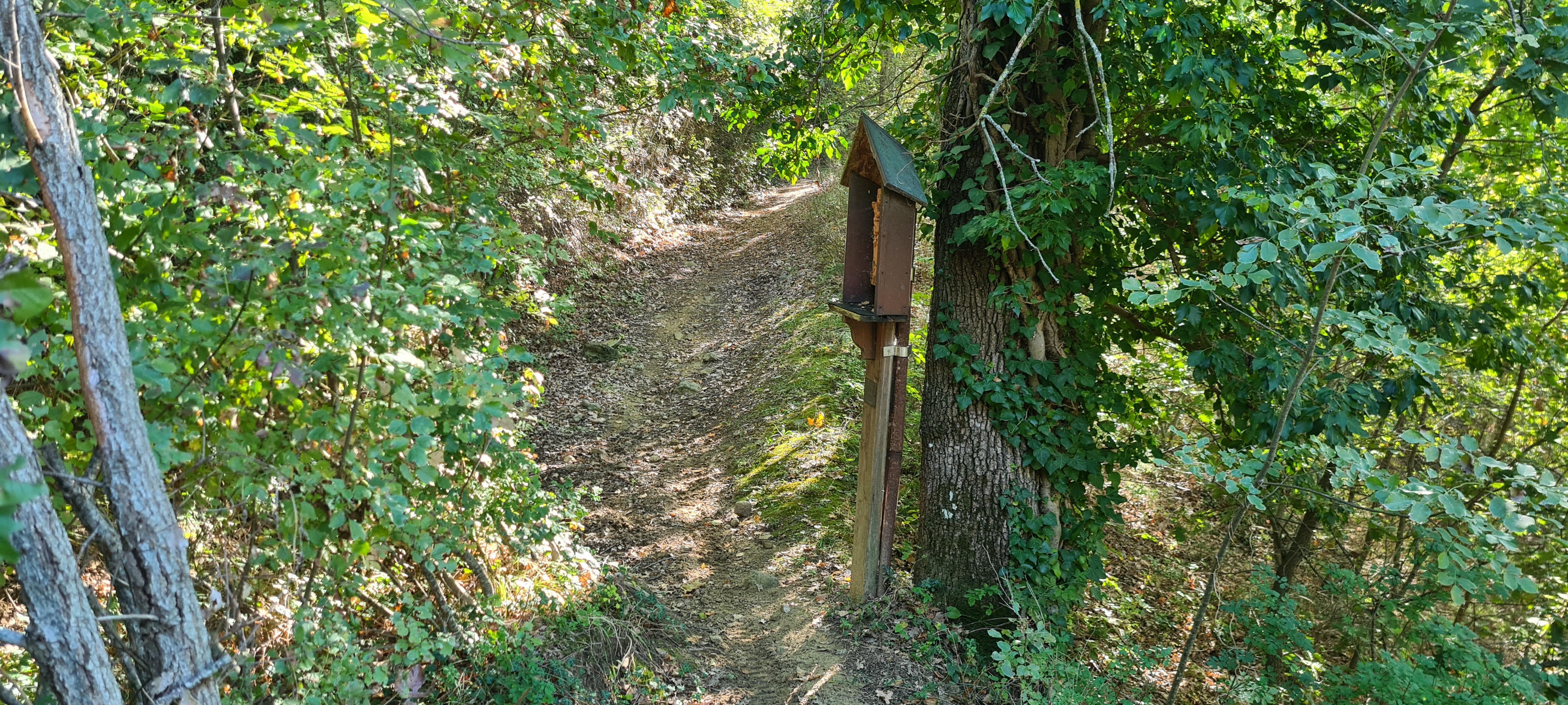 Terminata la breve discesa si percorre un tratto in falsopiano, per poi iniziare a salire, con pendenze molto dolci, sempre in ambiente boschivo, fino a giungere nei pressi di un rudere con a fianco un'altra delle nicchie (anch'essa un po' in stato di abbandono).