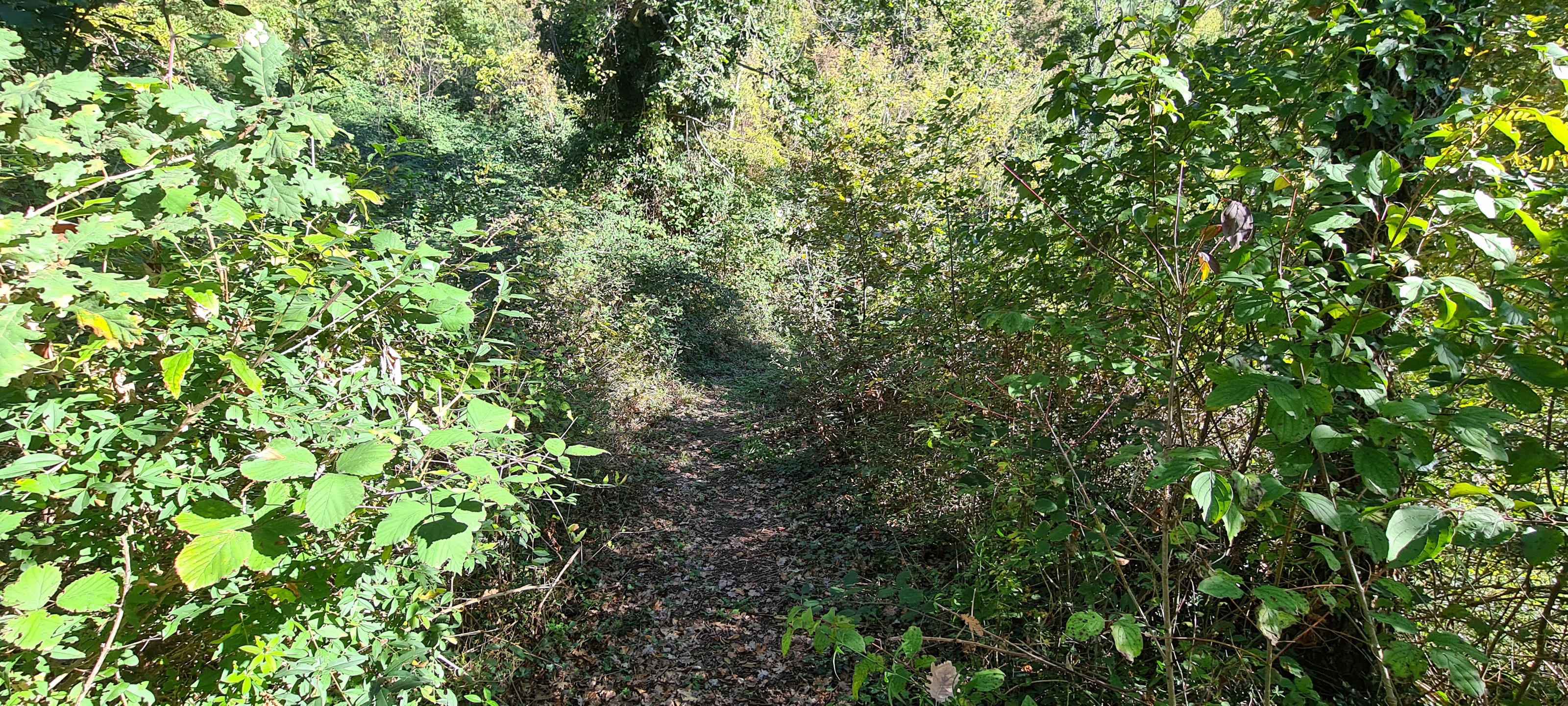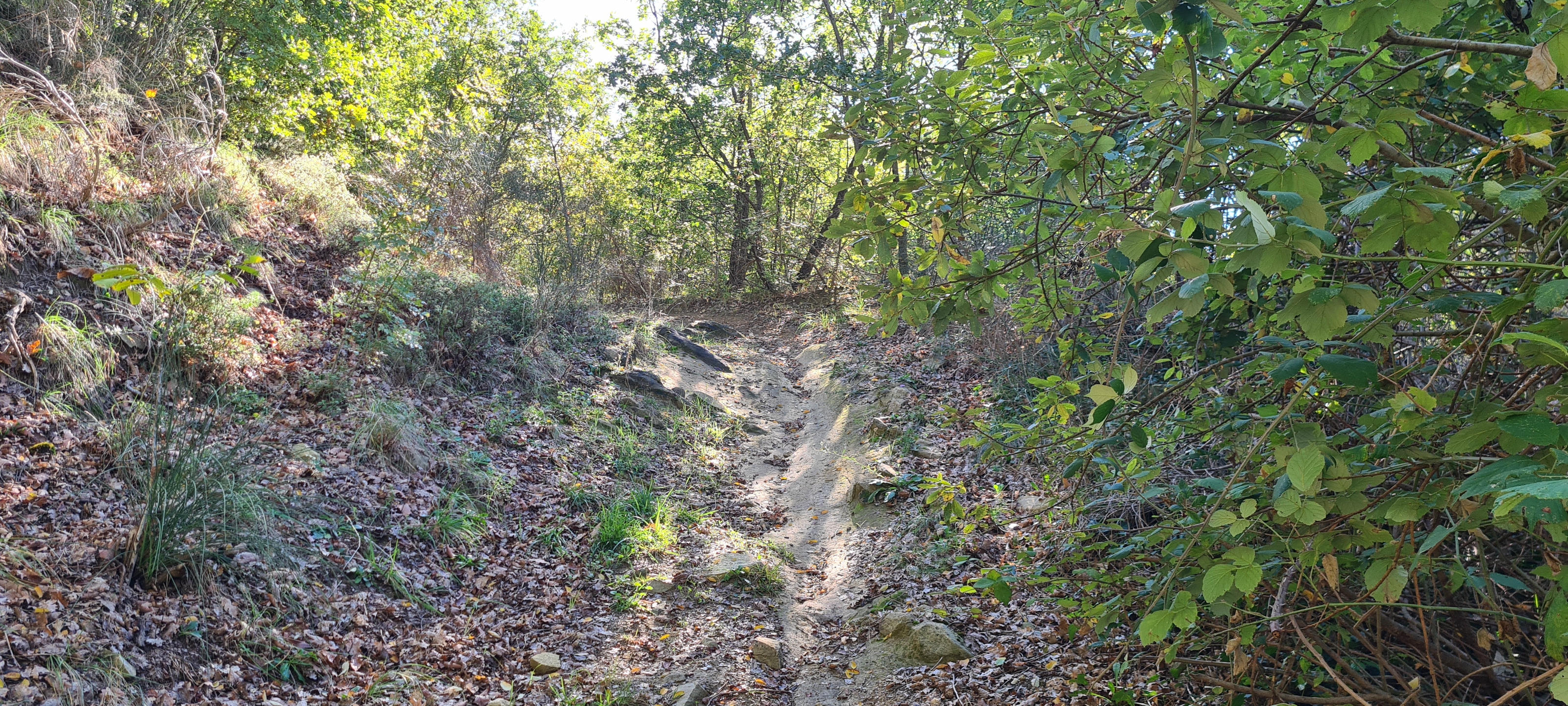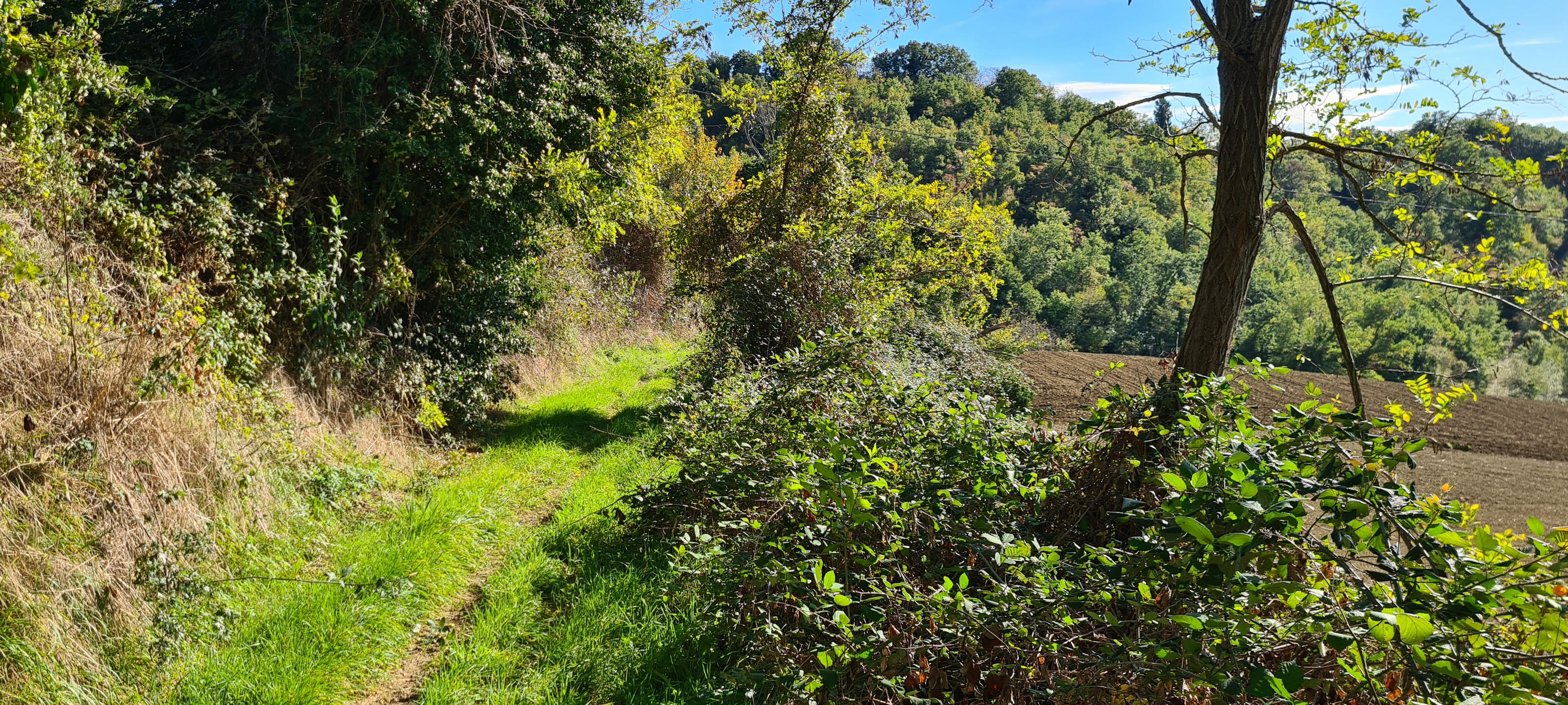 In questo punto il sentiero si perde ed occorre risalire attraverso il campo, rimanendo sul margine tra di esso ed il limitare del bosco (traccia non presente). Giunti al punto più elevato del campo si ritrova la traccia che si immerge nel bosco, ed inizia a salire in maniera più decisa verso Santa Maria in Silvis.