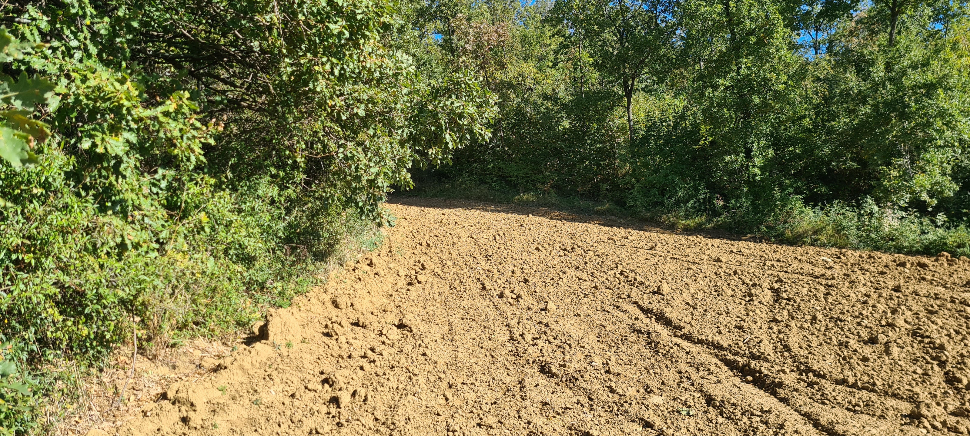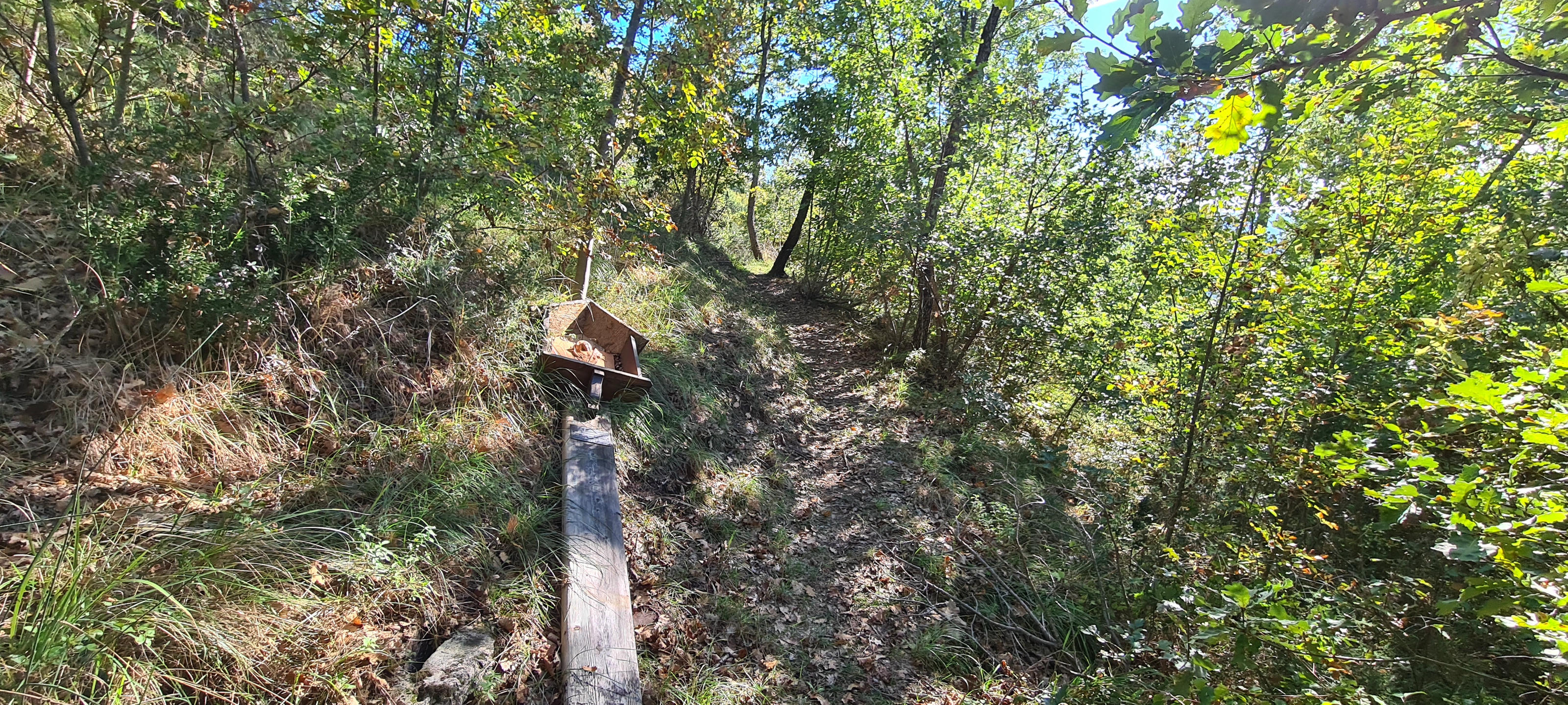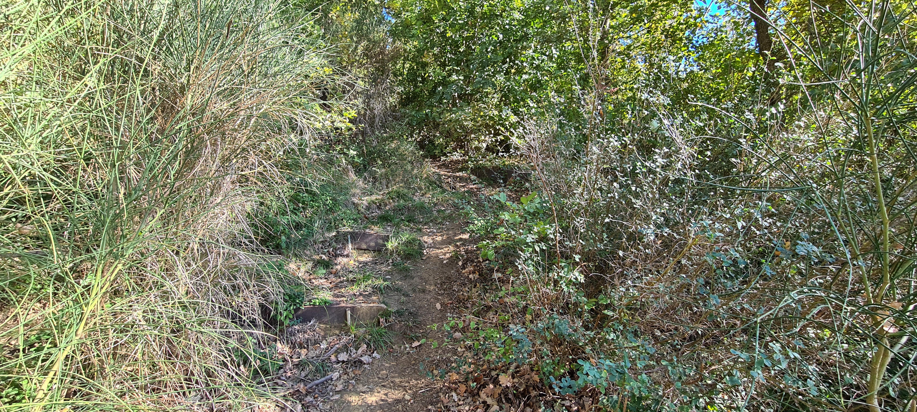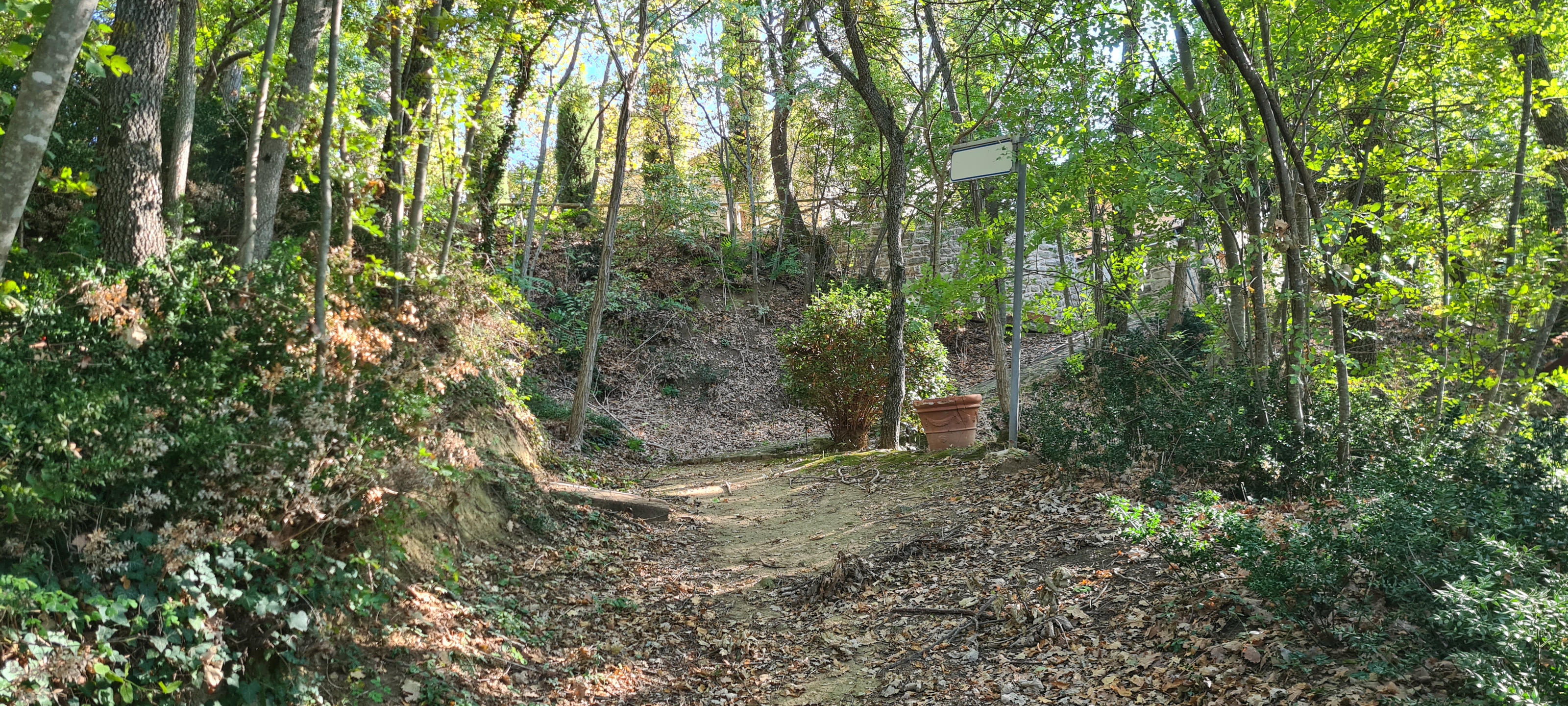 In questo punto il sentiero si perde ed occorre risalire attraverso il campo, rimanendo sul margine tra di esso ed il limitare del bosco (traccia non presente). Giunti al punto più elevato del campo si ritrova la traccia che si immerge nel bosco, ed inizia a salire in maniera più decisa verso Santa Maria in Silvis.